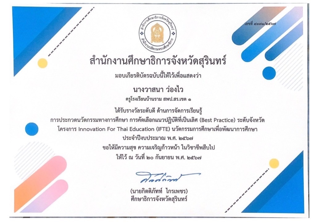 ชื่อผลงาน : รางวัลนวัตกรรมทางการศึกษา การคัดเลือกแนวปฏิบัติที่เป็นเลิศ (Best Practice) ระดับจังหวัด